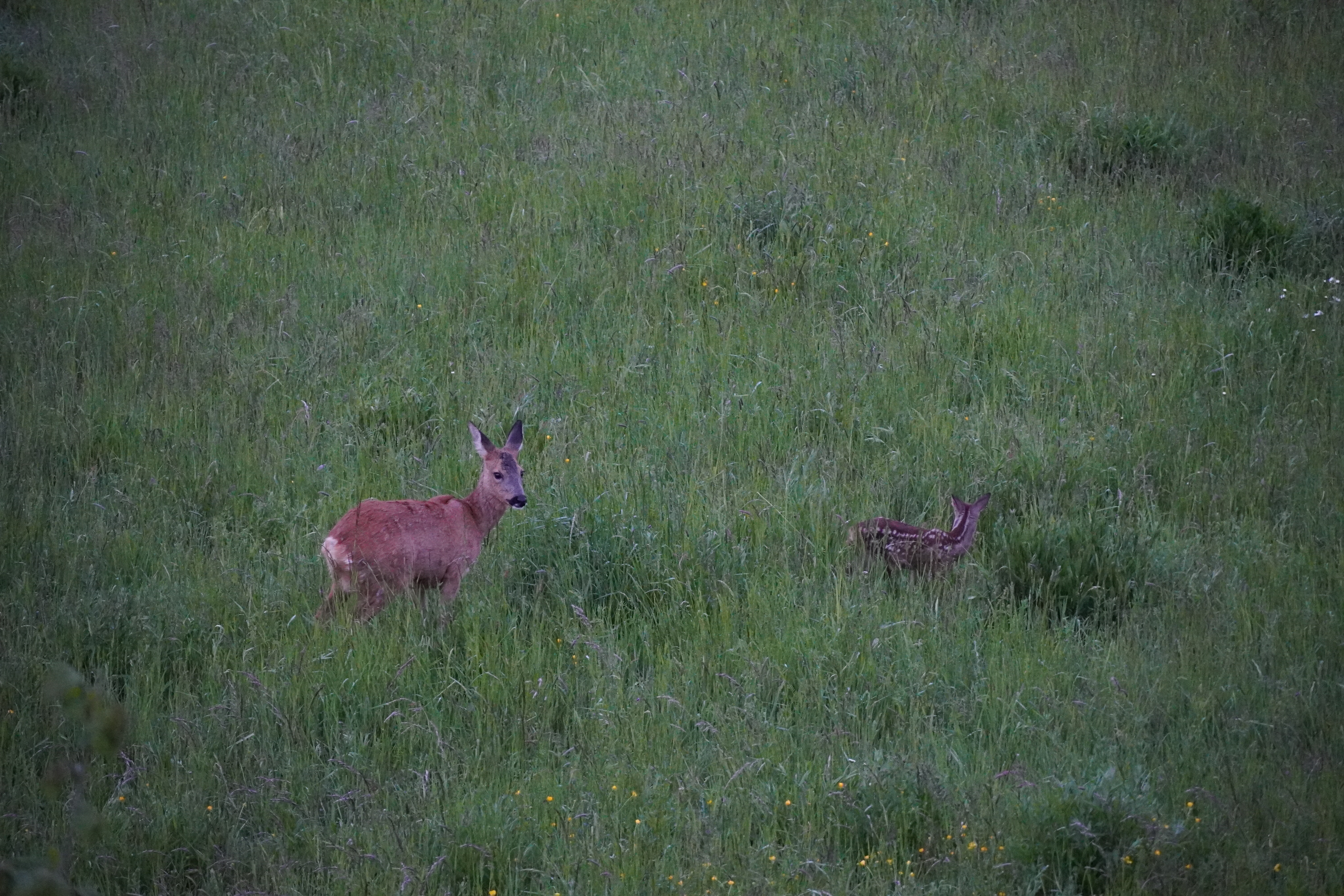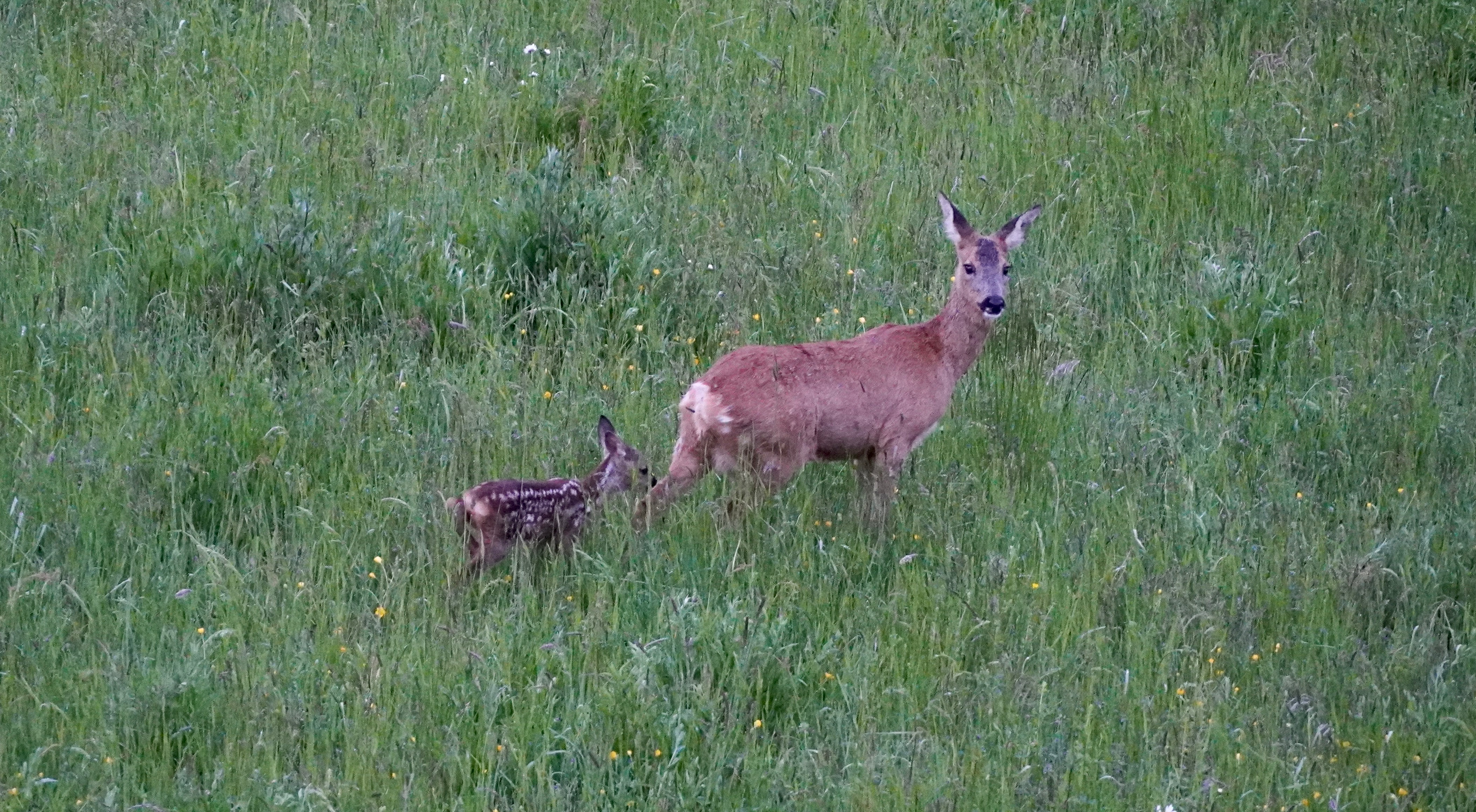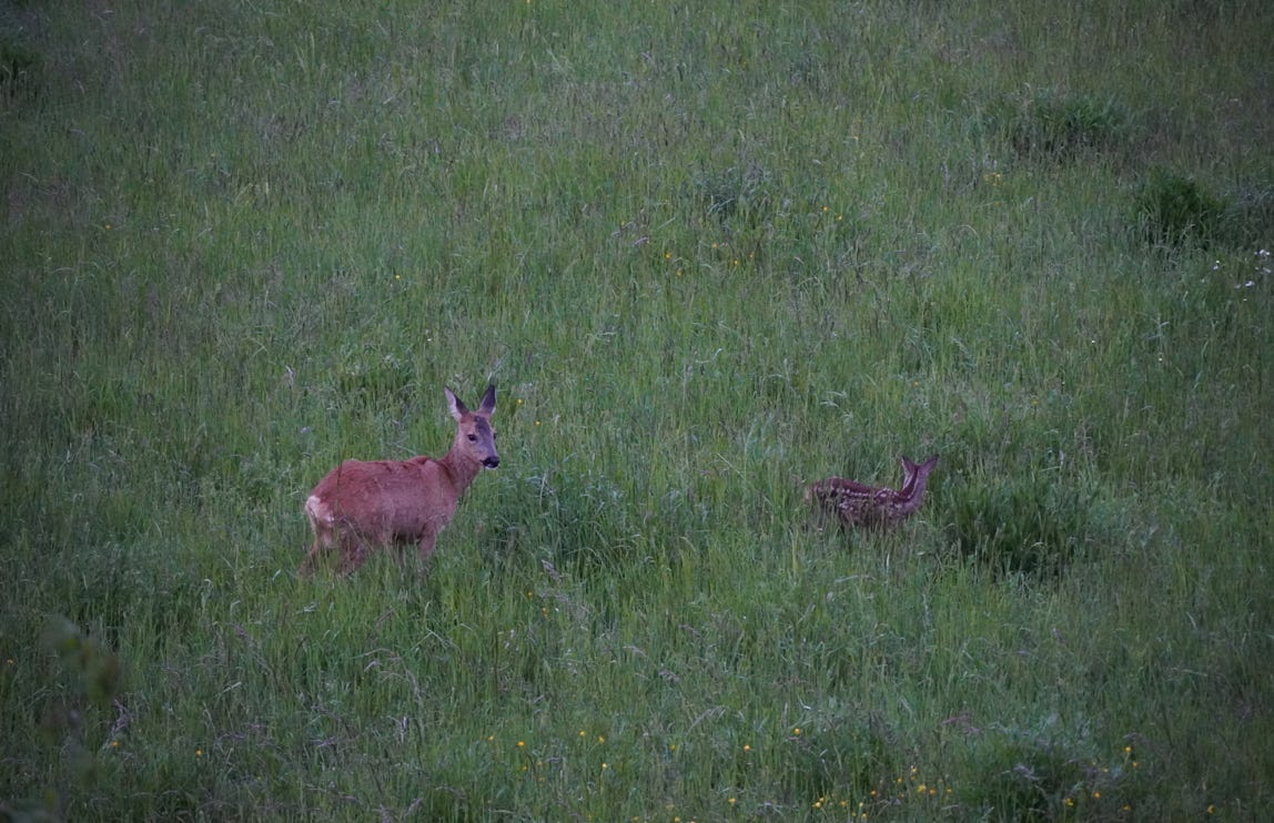 Das Reh mit Kitz war im Mai auf der Wiese hinter dem Haus zu Gast.
