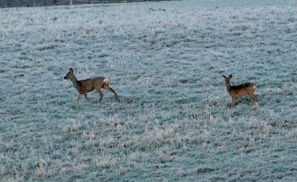 Es ist noch einmal frostig geworden. Die Pfützen sind zugefroren und ich mache mich auf eine Spaziergang um den Ort.